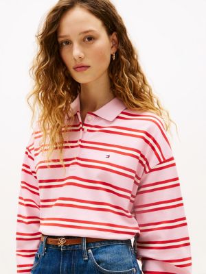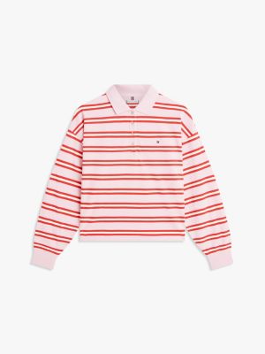 This stretch cotton pique polo shirt showcases a contemporary aesthetic, with a relaxed fit and striped design enhancing the long-sleeved style.