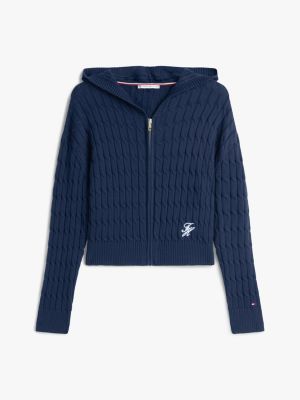 The all-over cable knit and hooded neckline add to the cosiness of this zip-thru layer, complete with intricate script logo embroidery.