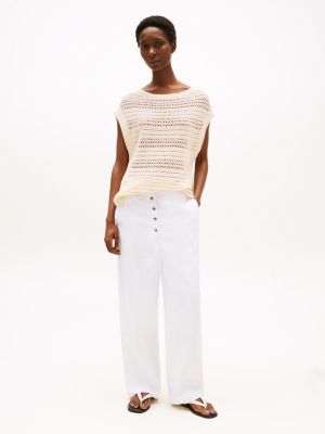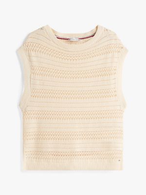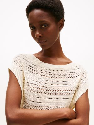 This crochet-knit sleeveless jumper goes from day to night with ease, designed with an effortless boat neckline for styling versatility.