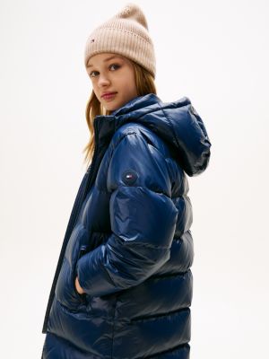 This shiny puffer jacket features a warm down filling and comes in a stylish longer length to protect against the elements.