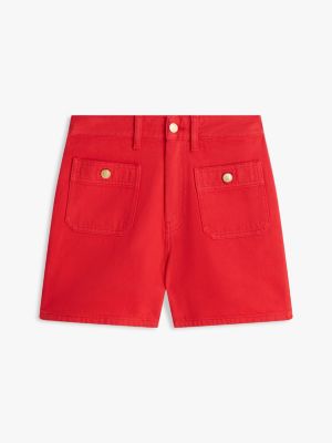 Complement polished looks with these clean-cut denim shorts featuring gold-tone buttons embossed with flag detail for a luxe touch.