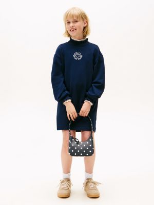 This charming dress features a pretty cross-stitched heart logo, plus ruffling on the neckline and cuffs for a distinctly feminine look.