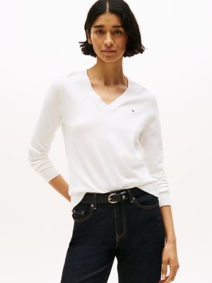 Woven from premium combed cotton jersey to a compact texture, this jumper combines gentle softness with a durable structure. The regular fit and V-shaped neckline create an easy, flattering drape that works equally well worn loose or tucked into trousers and skirts. It's finished with rib-knit trims, while stylish stitch detailing at the cuffs introduces a further hint of polish. An adaptable layering piece, it's perfect for guiding your wardrobe through the changing seasons or transporting you seamlessly from the formality of the office to your relaxed weekend plans.