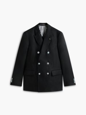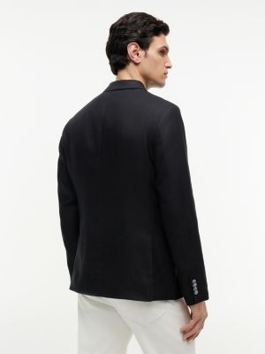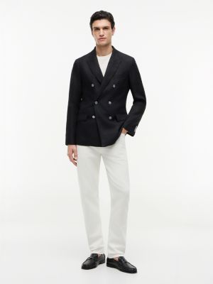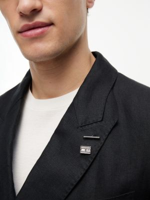 This double-breasted blazer is crafted from pure linen, with peak lapels hosting a flag pin for a refined evening look.