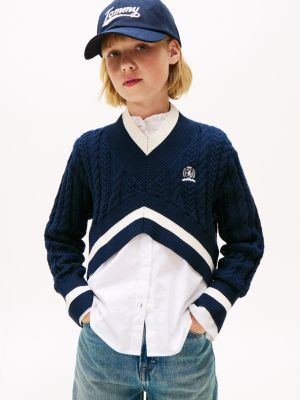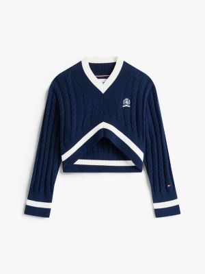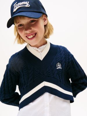 Keep cosy and on-trend in this cropped cable-knit jumper, featuring contrast striped trims and detailed with TH crest embroidery.